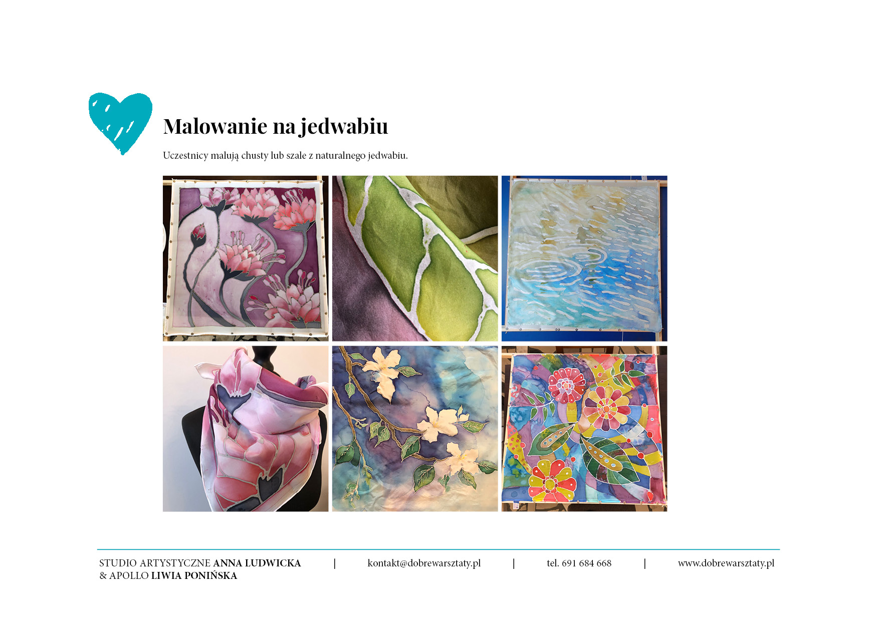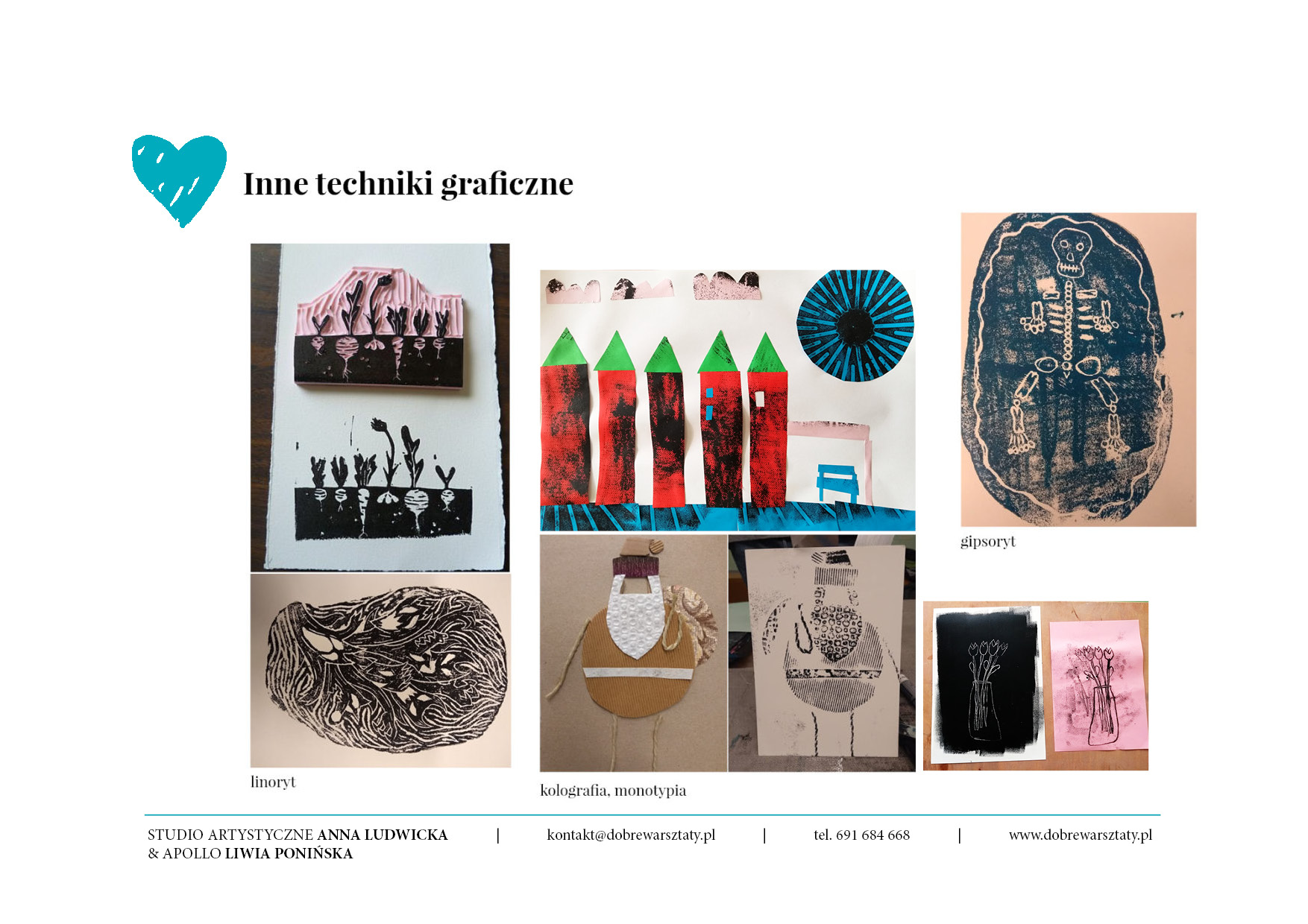 Temat, technikę i stopień trudności warsztatów dostosujemy do założonego przez nauczyciela celu, preferencji i potrzeb dydaktycznych. Bierzemy także pod uwagę okazję, liczebność grupy, czas przeznaczony na warsztaty oraz wiek grupy docelowej (dzieci, młodzież).
